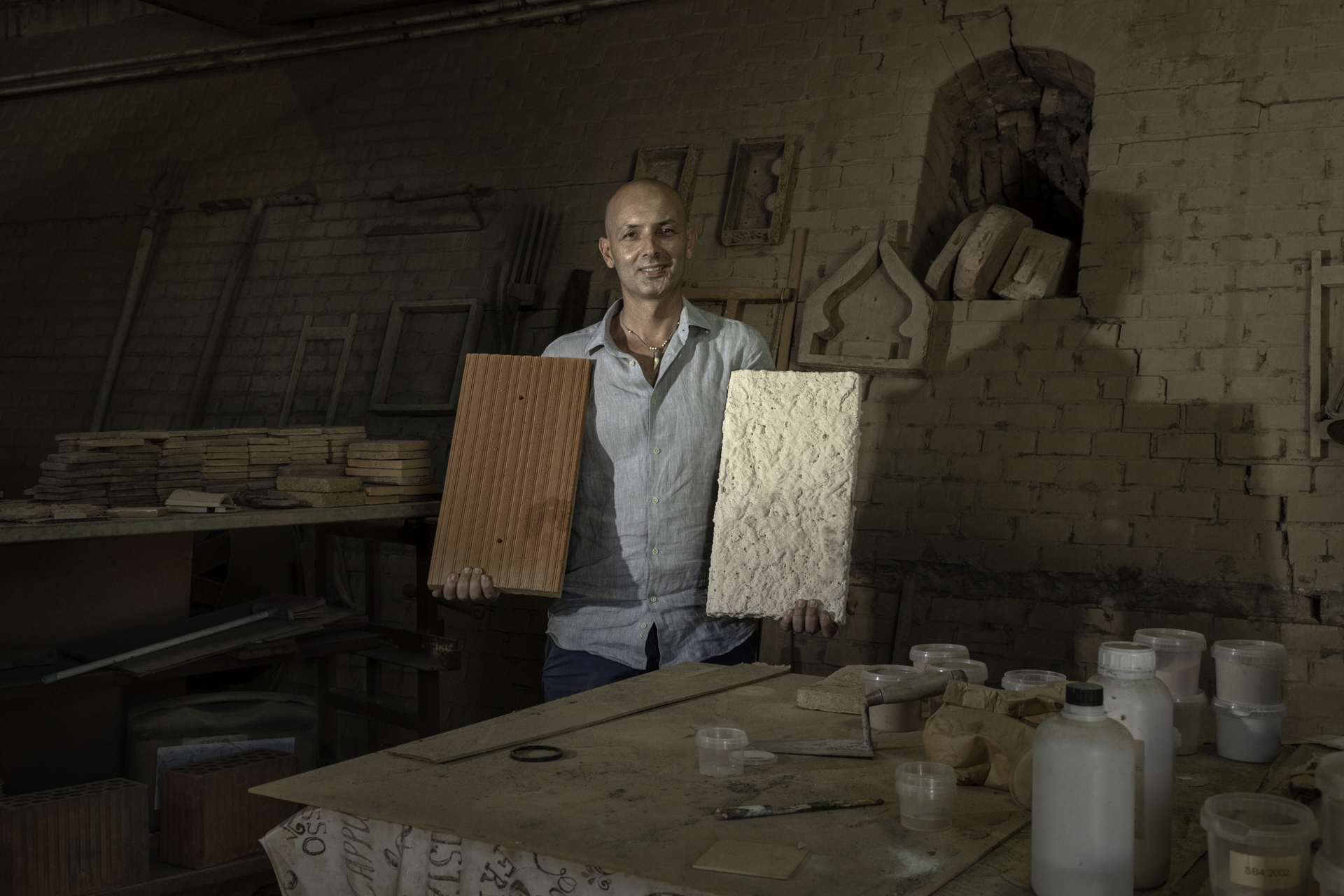 Luca Fonti, proprietario dell’Antica Fornace Fonti, mostra una tavella in laterizio prodotta per il progetto di ripristino dei banchi a ostriche e la stessa rifinita con la stesa di bio-intonaco, Rovigo, 17 settembre 2025.