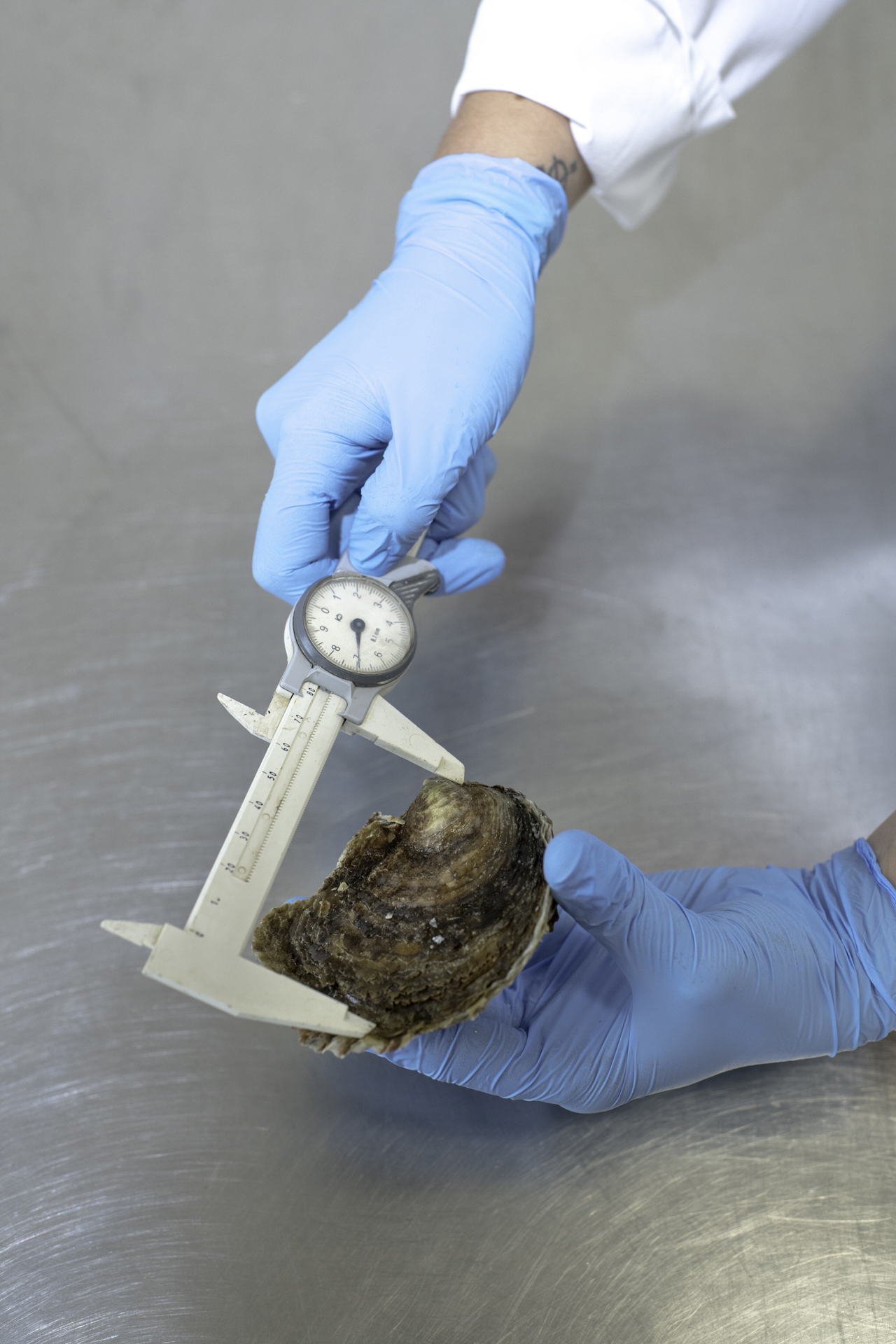 Una biologa della Società cooperativa M.A.R.E. misura la larghezza della valva piatta di Ostrea edulis per verificarne le dimensioni, Cattolica (RN), 23 ottobre 2025.