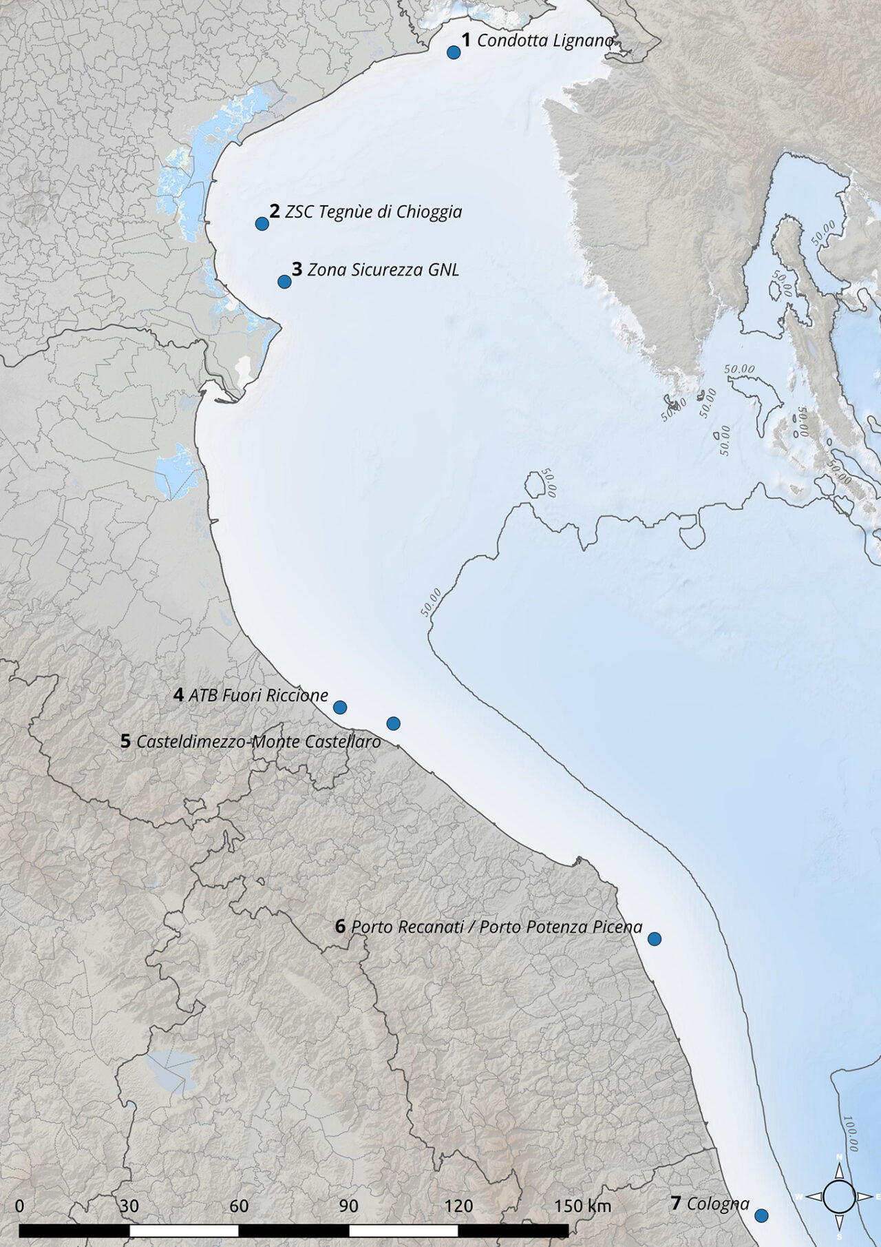 I siti scelti per ricostruire le ostricare naturali sono sette e si snodano tra le 2 e le 5 miglia marine in Adriatico, di fronte alle coste italiane dal Friuli-Venezia Giulia all’Abruzzo.